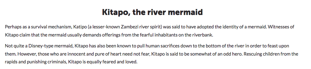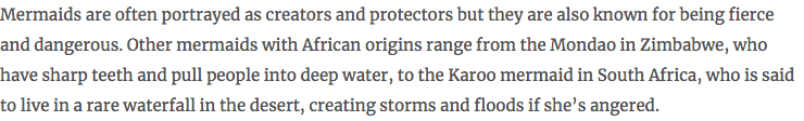 African Mermaids My family has ties to South Africa. It is where my great-aunt and great-uncle lived and died. So I was particularly interested to learn that many of the African mermaid legends seem to initially focus on this particular region.