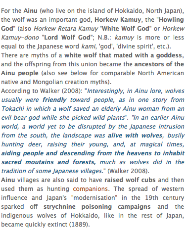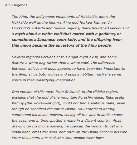 I have read several accounts of the Ainu retelling their origin story of a wolf-like creature mating with a goddess to create them. The goddess remains unnamed and the wolf is sometimes referred to as a dog. These accounts, particularly when coupled with Ainu bear worship, casts doubt on these stories. However, I will provide information for readers to access and decide for themselves.