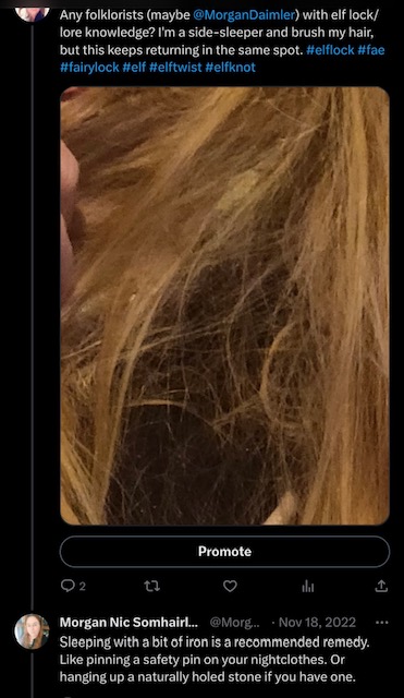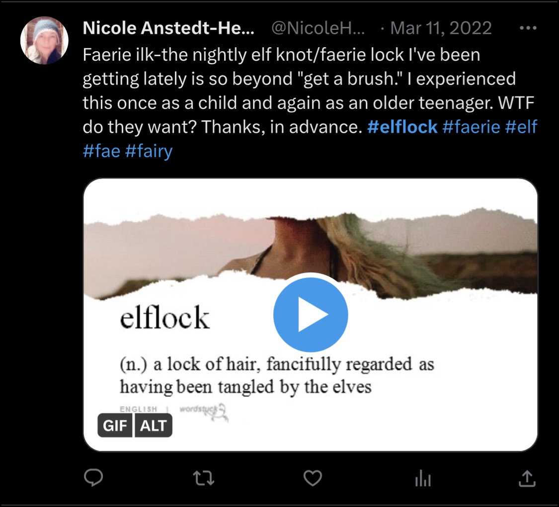 Despite what people think, there has not been a great deal written about elflocks. The response I received from an “authority” on faeries, underscores this.