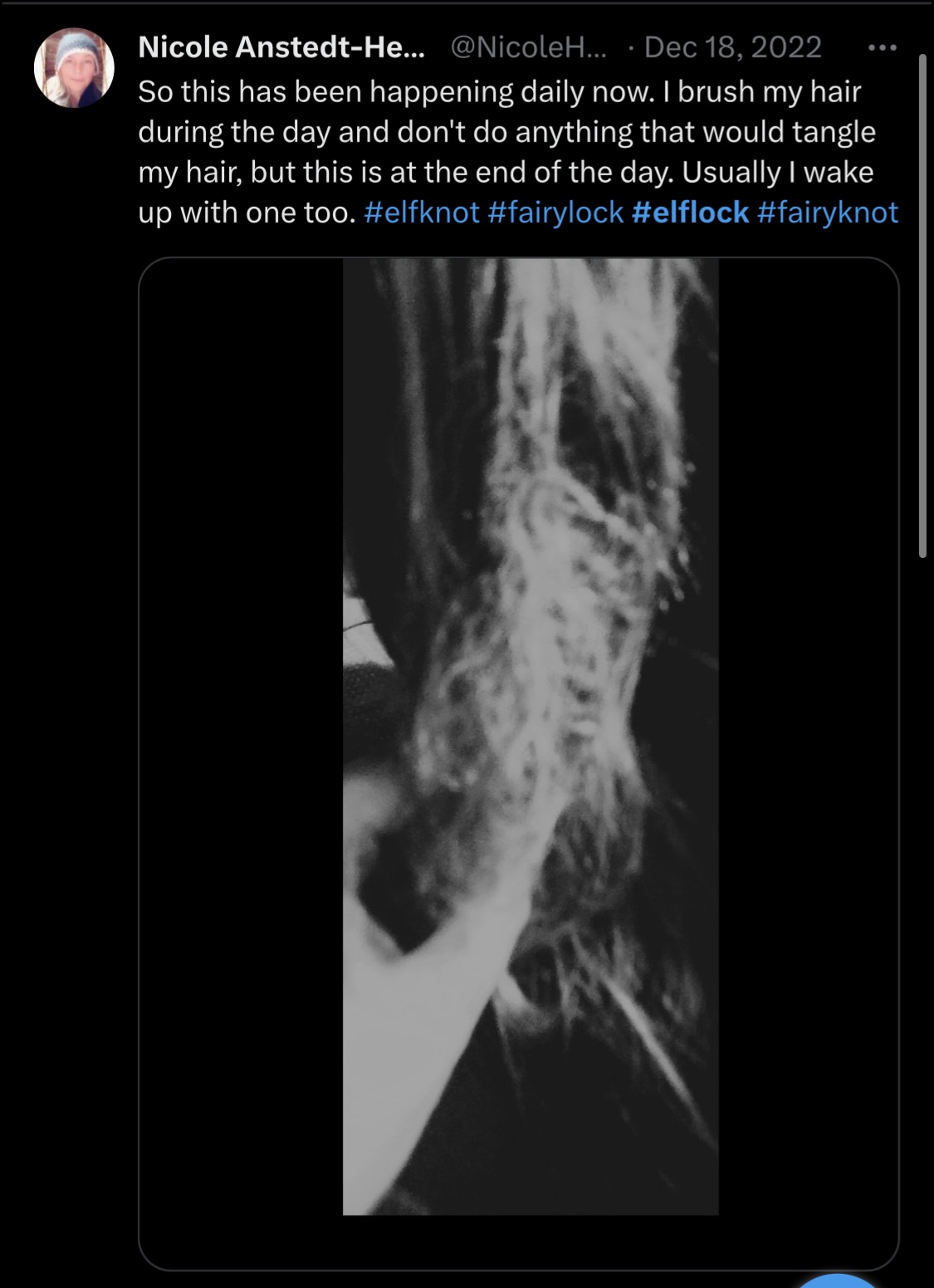 My grandmother in Scotland would say to not brush out the elflock myself (sometimes you have no choice), but her interpretation was that the elves were calling me home to Scotland. I would travel to her (portal/jumping/astral) when they happened. It did not cause us fear as they would humans. More this was us needing to understand what those on the other side of the veil wanted–what they were trying to communicate.