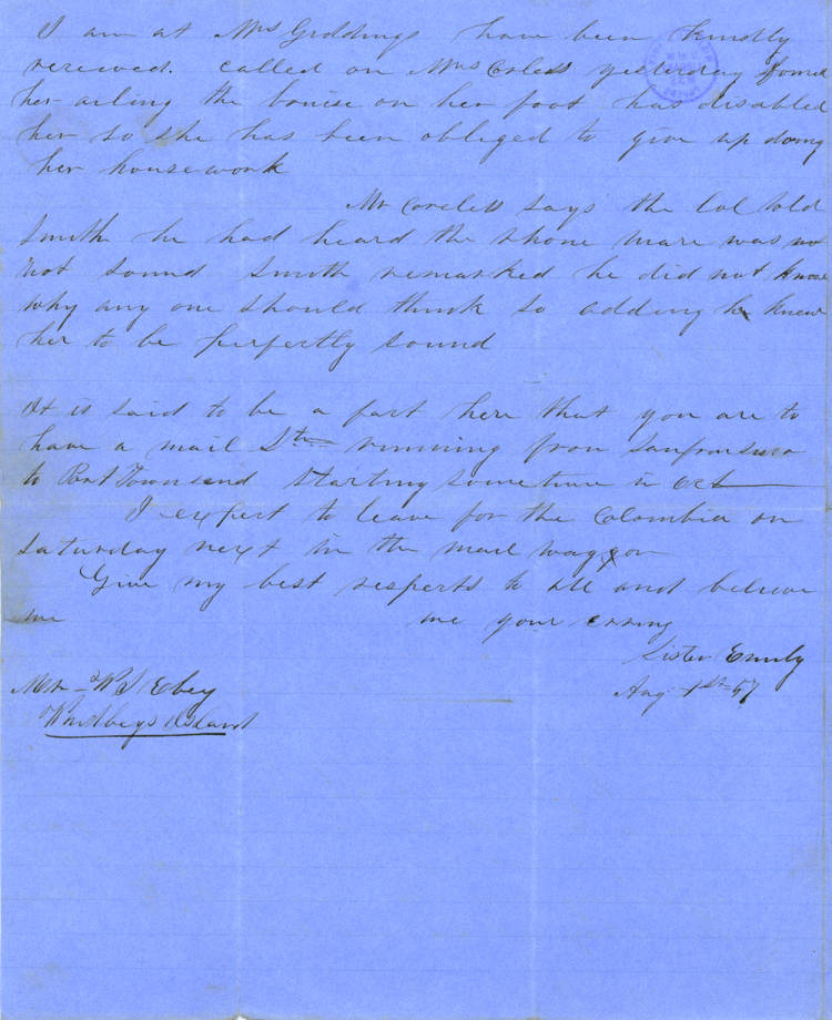 Emily moved to Oregon with her daughter. She lived with her brother and then with her sister for some time but there are many letters showing her distress over a lack of money. There are some indications that she was working as a teacher or considering doing so when she met Dr. L.M. Bell and married.
