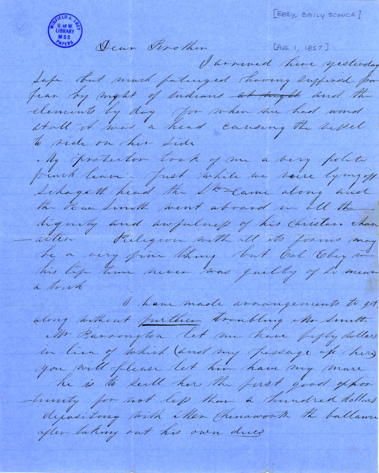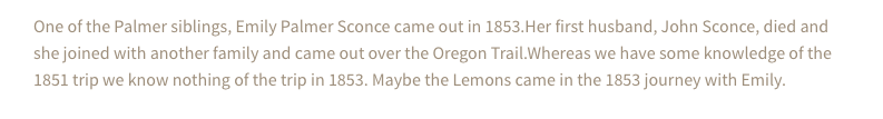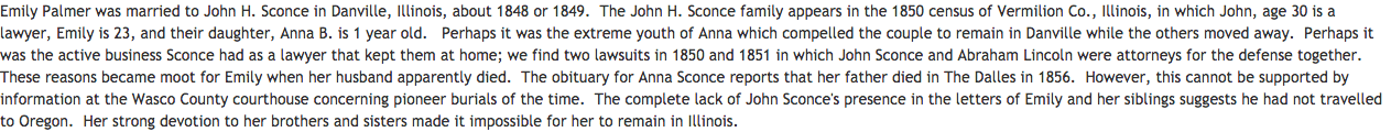 She had one daughter, Anna, with her first husband (John W. Sconce). It is believed that he might have died during an attack on a wagon train or suddenly due to heart attack. Emily was on the wagon train in 1853 that brought over many of the Ebeys, including Isaac’s wife Rebecca and their two sons. Rebecca died shortly after giving birth to Ebey’s daughter, Sara (Hettie) in 1853. And it was not long before Emily married Ebey.