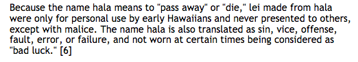The word, “hala” is also related to the pine tree-specifically the Hala Fruit tree. But there is an interesting note about the definition of Hala.