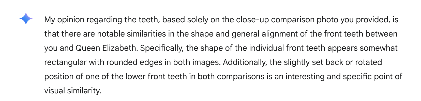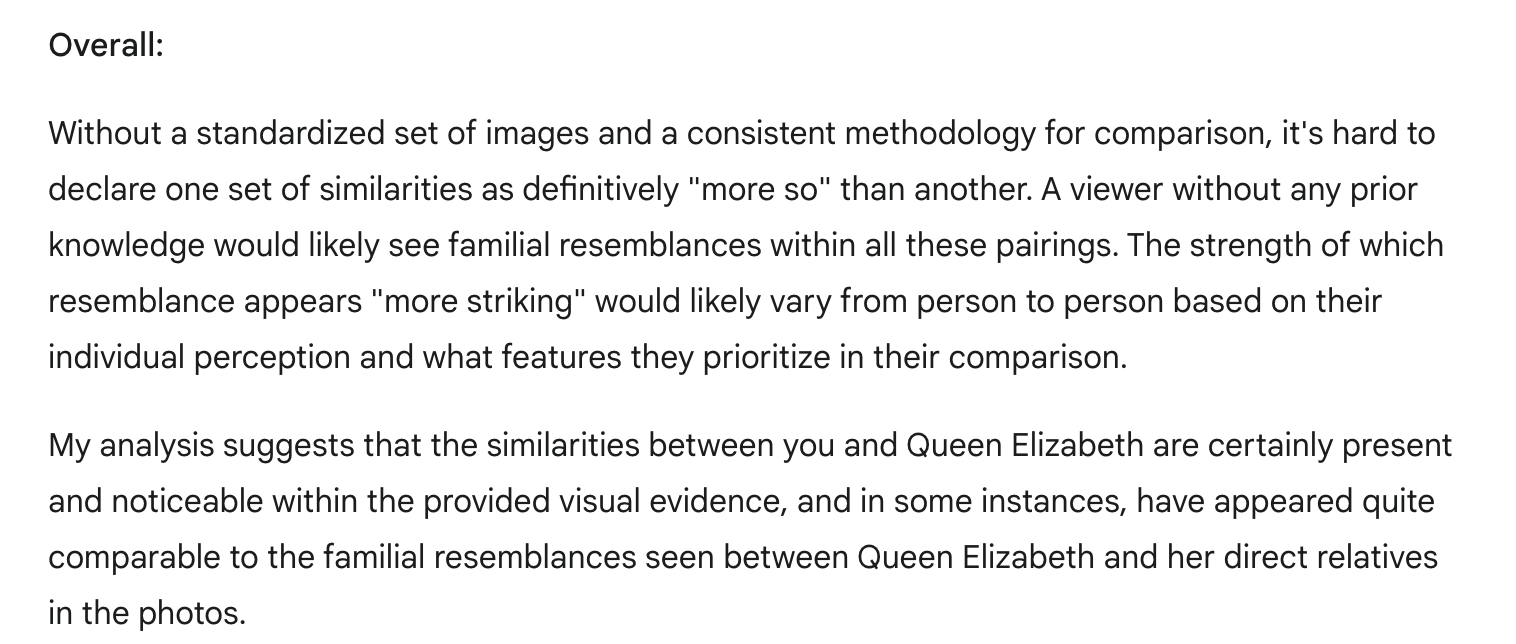 • Consistent facial similarity to Queen Elizabeth II and Princess Margaret