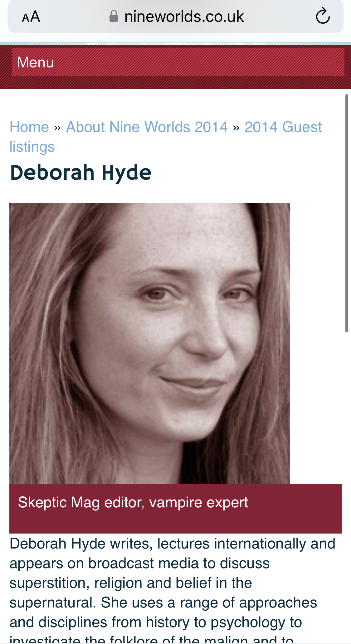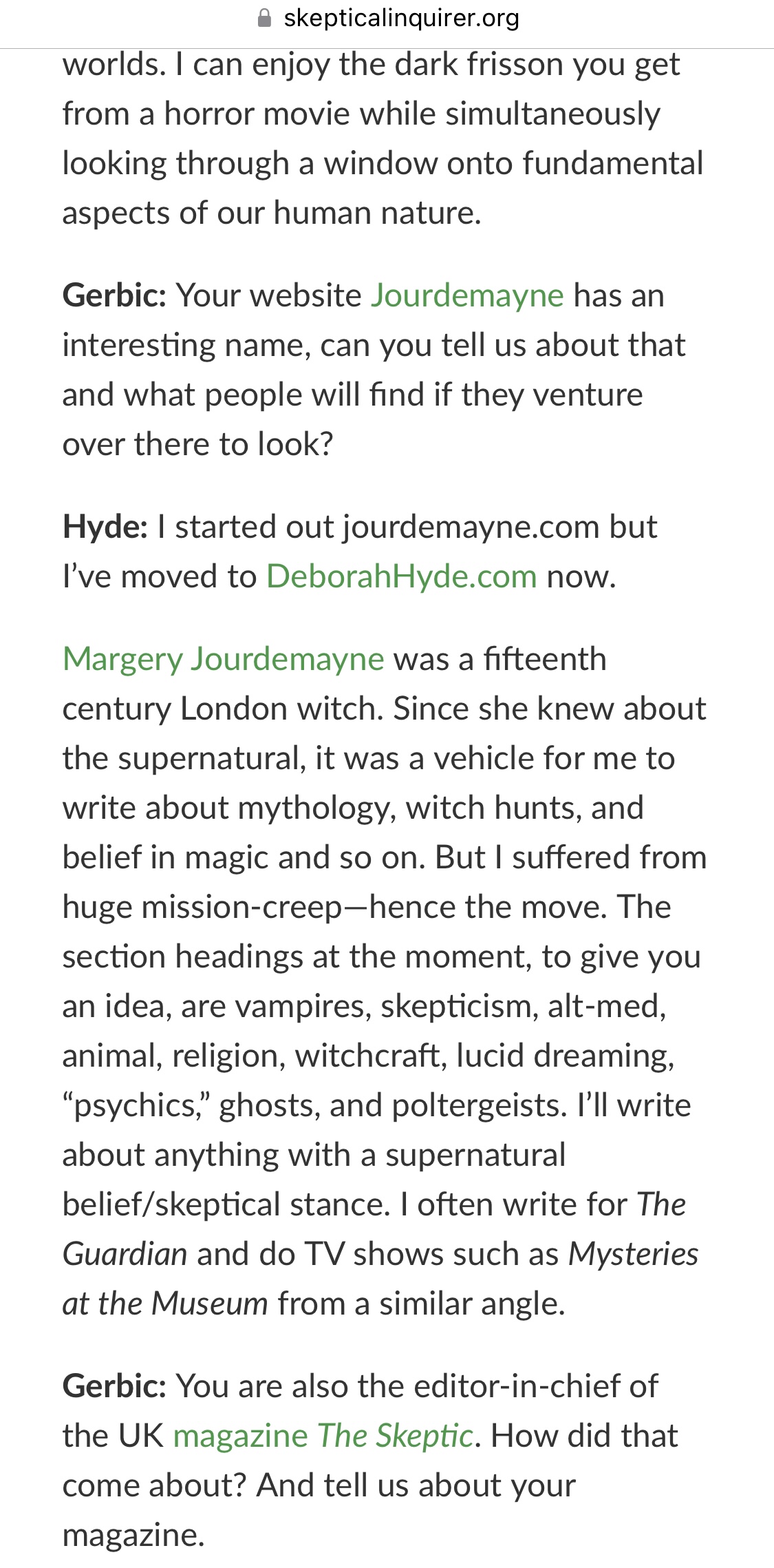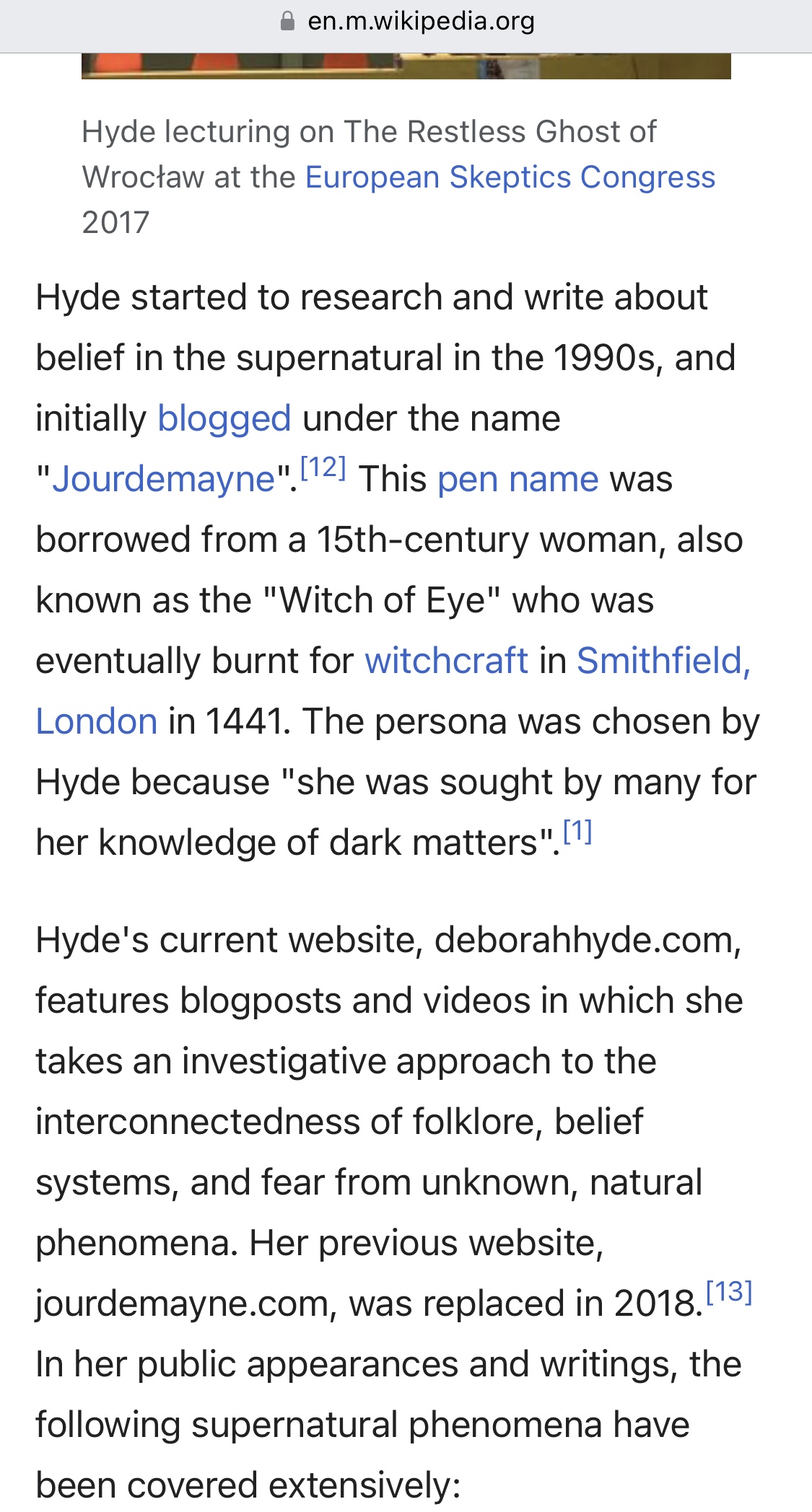 Deborah Hyde is described as a self-proclaimed vampire expert. She also had her website at Jourdemayne.com. It is not clear why she focused on Jourdemayne out of all the various witches held and executed as witches.