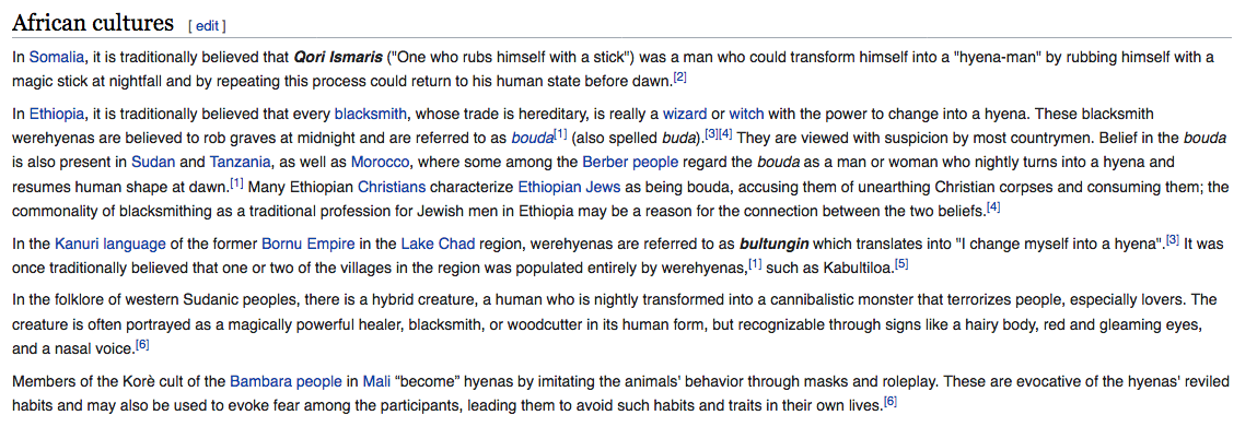Many countries have shapeshifters, but not all are werewolves. Strangely, those countries that do not have the typical werewolf lore are often a natural home to pythons-Australia, SE Asia, and Africa.