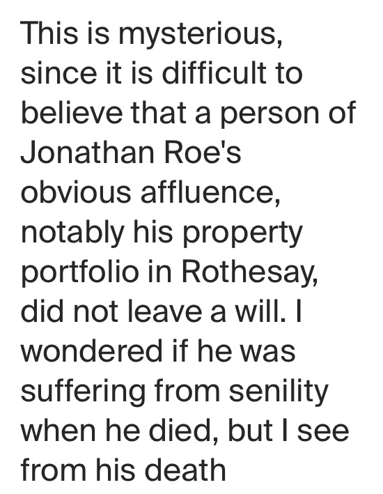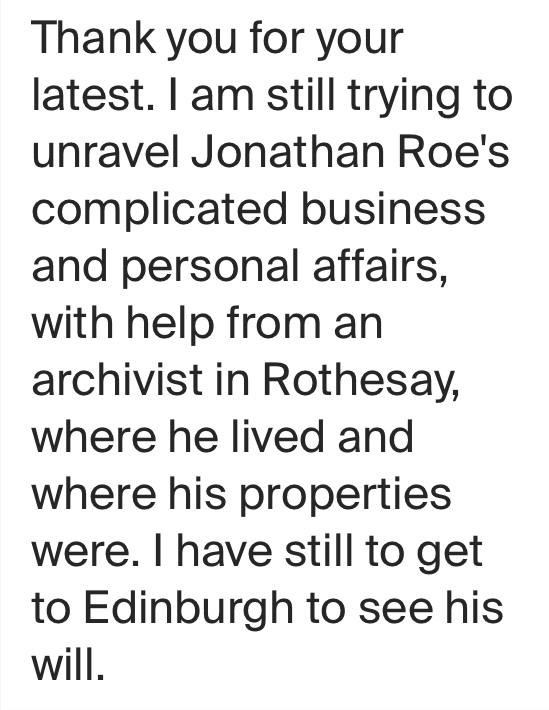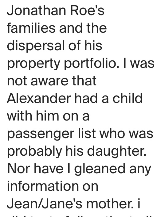 She was not a DNA match on Ancestry.com, nor had a link to a family tree that I was aware of. There was some indication or slight hint that she and Lorn doubted my blood relation to the Roe family and, specifically, Jonathan. He thought maybe I was from Thomas. I assured Dr. Macintyre that I had a DNA test and that Alexander’s son, Douglas, was my grandfather. My father, Richard, was Alexander’s grandson. This was via their information, family photos, and birth certificates.  So if Alexander was of Jonathan, then so was I. So the question was who Alexander’s father was. However, I believe the birth certificate says Jonathan Roe.