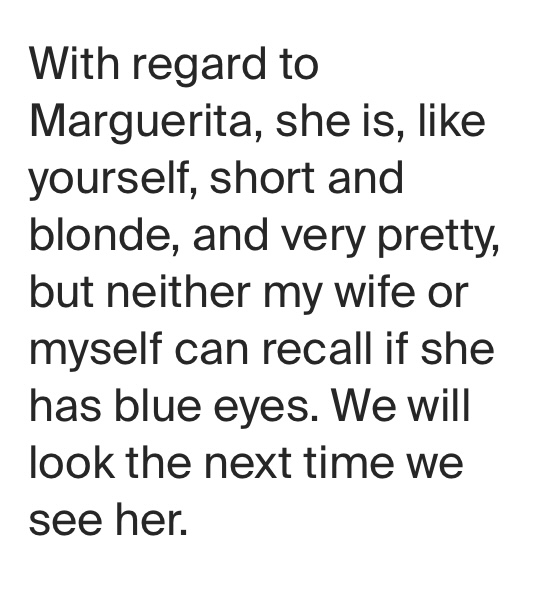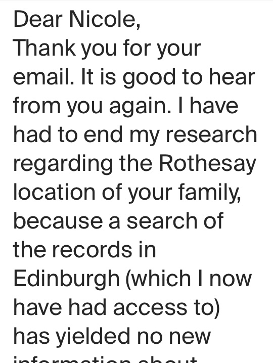 While he mentioned that his friend’s name was Margarita, he never disclosed what she was looking for or why. I did not want to pry. A part of me was grateful to still have some family in Scotland and confirmation of the genealogy being as difficult for them as it had proven to be for me.