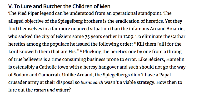 The non-fiction reality is likely another planned targeting of groups considered “pure.” In this case, it was the children of Cathars targeted by the piper.