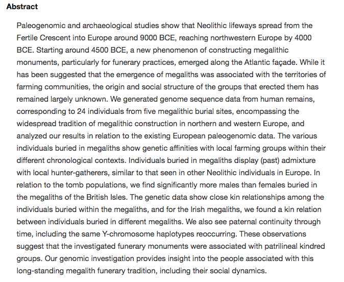 The burial information is of note because it also highlights that partriarchy or dominance of patrilineal lines had taken root. What I would like to know is where the females had been buried or if there was a drop in female population? Any instance of faminine or infanticide or sacrifice where females were lost could explain the high number of males within the tombs. I am also curious as to why we do not see a greater admixture of genetic material or specimens among the dead? Are these revered individuals because they had land and could therefore afford a tomb (akin to a modern family crypt)?