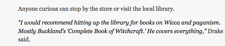 I do not know this practitioner but I would be hesitant of anyone who has been a Wiccan for 20 years and owns their own witchcraft store only recommending Buckland or directing people to the library rather than her own offerings on which she could then answer questions or give guidance based on her training. When referring to the library, I would have mentioned more books or more about the different traditions of Wicca. She could have also developed and offered a basic reading list for those new to Wicca.