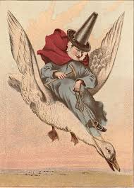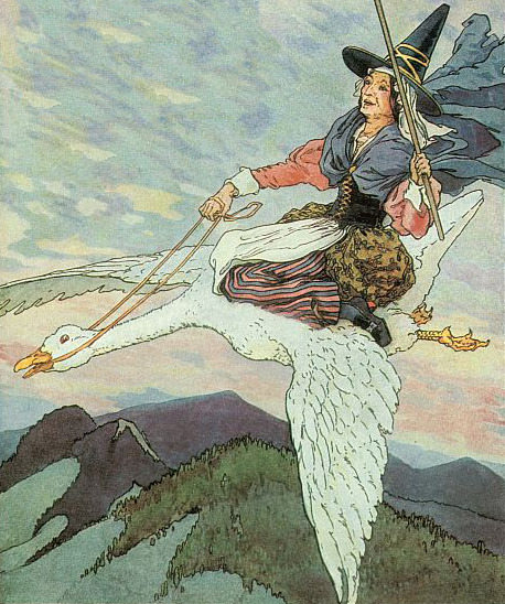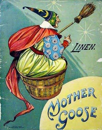 Interestingly, Mother Goose is also sometimes depicted as sitting in a basket. The use of basket imagery would harken to Red Riding Hood and also the Slavic Baba Yaga. Some tales of Baba Yaga have her as part of a triune and, thereby, correlating to the myths of Aphrodite, Hecate and other triune goddesses.