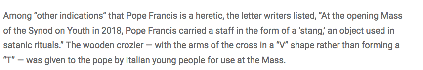 In 2019, the pope was accused of heresy as others noticed his pastoral staff looked like a stang. The iron nail seems to be going through the knees of a figure if it is the stang shape and while the nub could be seen as Jesus hanging from the cross, it could also be the male “nub” of the horned god represented in the male witch staff.