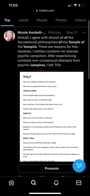 That entire affiliated human group from the early 1990s will get exactly what they deserve and they all know what that means– particularly those in Ohio–“sniff the finger.” Those consequences will not be of my hand or tooth. The vampyre are to no longer have any interactions or dealings with these humans that made money off of us, our experiences that they claim were their own, our culture, our representation, or our stories.