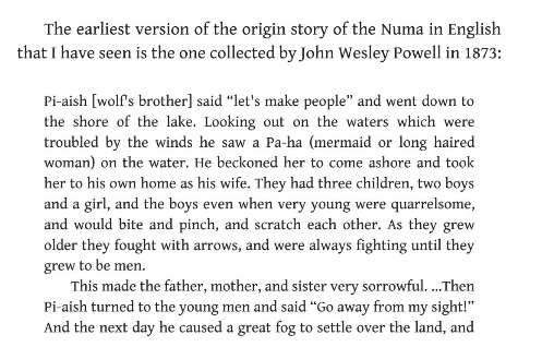 Interestingly, the origin story of the Numa is similar to the Biblical story of Adam and Eve. There is also mention of a second wife and that the first might have been a mermaid. Additionally, the story also points to a set of wild children with the mermaid that the creator sent away and were lost, as well as children with the second wife that populated the earth.