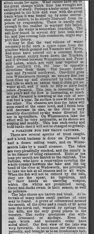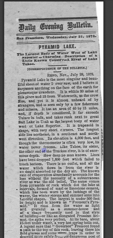 While I was treading water in Pyramid, nothing bit me or even seemed to come near but it felt as though it could at any moment. The lake is huge. It covers 125,000 acres and is 344-feet deep. I wondered about the stories of the water-babies and the mermaids that roam the lake. Then I remembered when I was working at a law office during after high-school, one of the secretaries told me stories about her summer job at the lake. She liked to scuba dive and so she was hired to fish bodies out of the water. We would hypothesize about inversion layers and various reasons bodies wouldn’t float to the top. But it was her old saying that rang through my head that day, in the glaring sun, as I dangled half of my body into the cold water, “Pyramid keeps her dead.”