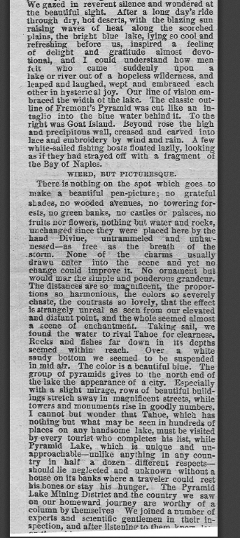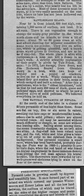 Aside from gambling, most people take Nevada for granted, but it is ancient. Pyramid Lake was once a part of the pre-historic Lake Lahontan and some of the oldest pretroglyphs in North America have been discovered there. It is located about 35 miles NE of Reno.