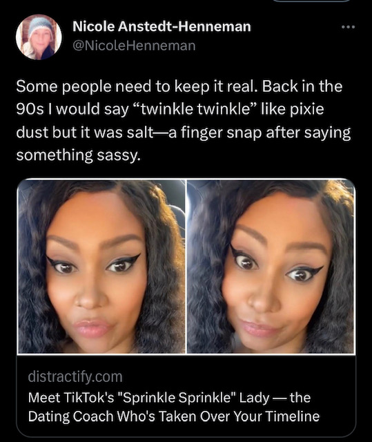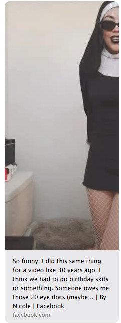 This I saw on TikTok and Facebook Shorts. It was a reenactment of something I was forced to do for a birthday skit back in 1991. They found someone who looked similar to me as long as she wore the sunglasses. In mine, the fishnets were black and I was wearing black shorts–not denim.