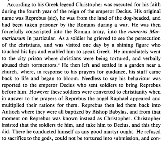 In my book, The Goddess Aped, it is the bloodline of the anointed that is in Christopher. He literally carries the “Christ Within.” He does not carry the burden or any shame. He is a magical shape-shifter of divine origin. It is the Greek and Catholic Churches that later come up with the story of Christopher carrying the “Christ” across a river. As my story details, there is an interaction between Christopher and a young princess/fallen angel and he does help her through the flood.
