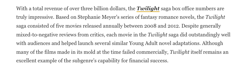 Outside of box office figures, getting exact earnings from Twilight can be difficult–particularly for merchandise. However, it is believed that the franchise has earned over $10 Billion dollars and continues to do so in residuals and licensing.